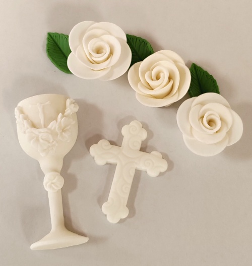 Biely set obsahuje biely kalich s hostiou (výška 10 cm), 3 biele ruže (priemer 4-5 cm), 3 zelené listy (4 cm) a biely ozdobný krížik (7,5 x 5,5 cm) z cukrovej hmoty vhodné na dekoráciu. Pozor! Kalich kvôli pevnosti obsahuje špáradlo.