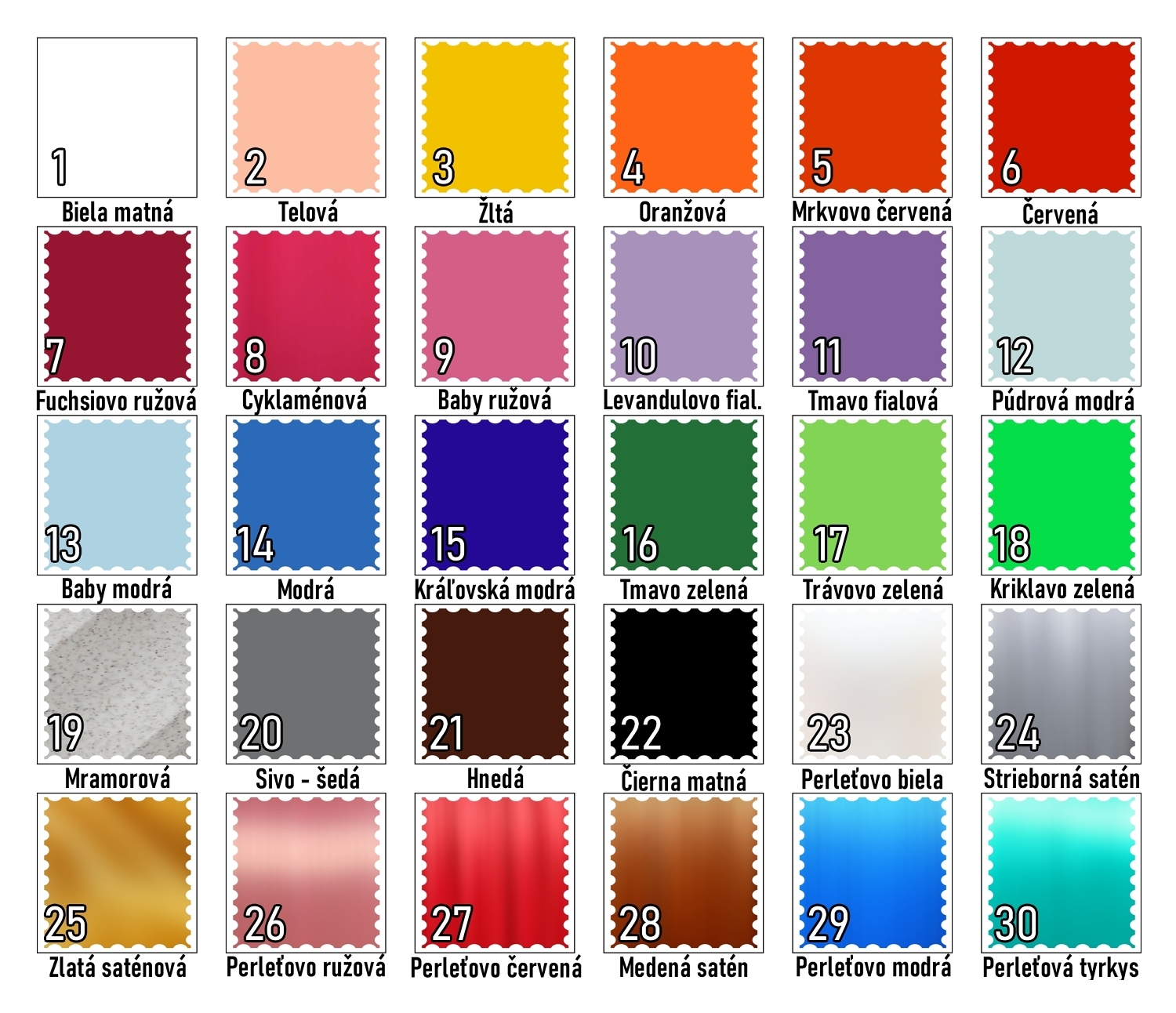 Farba: v náhľade produktu si zvoľte farbu, o ktorú máte záujem. V ponuke máme širokú paletu matných, perleťových alebo metalických zápichov. Vzorkovník farieb nájdete v obrázkoch produktu alebo po kliknutí na tento odkaz → Vzorky farieb